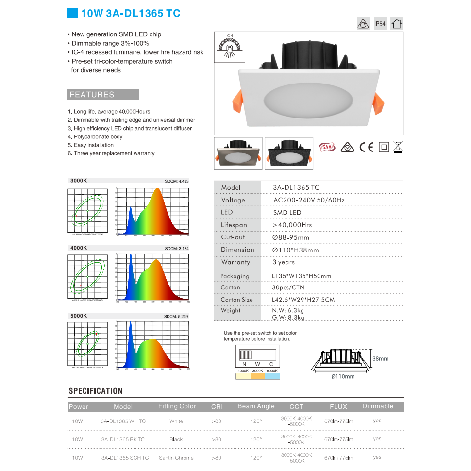 • Selectable colour temperature with an inbuilt DIP switch, 3000K/4000K/5000K