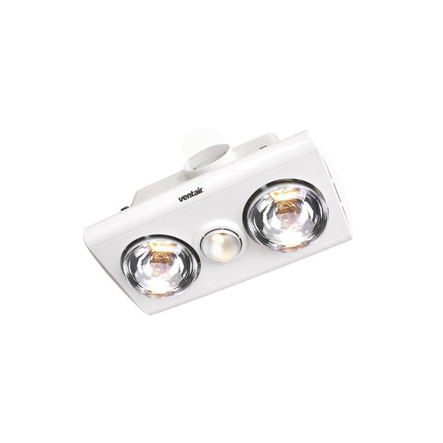 New improved design with higher airflow, the builders choice 3in1 Bathroom unit with 2 x 275w infrared heat lamps with centre R63 60w incandescent globe, side ducted with draft stopper.