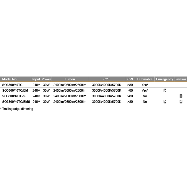• 30 watt integral constant current trailing edge dimmable LED driver (excluding SO3800/40TC/S, SO3800/40TC/EMS)