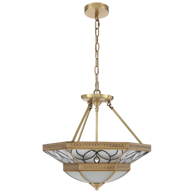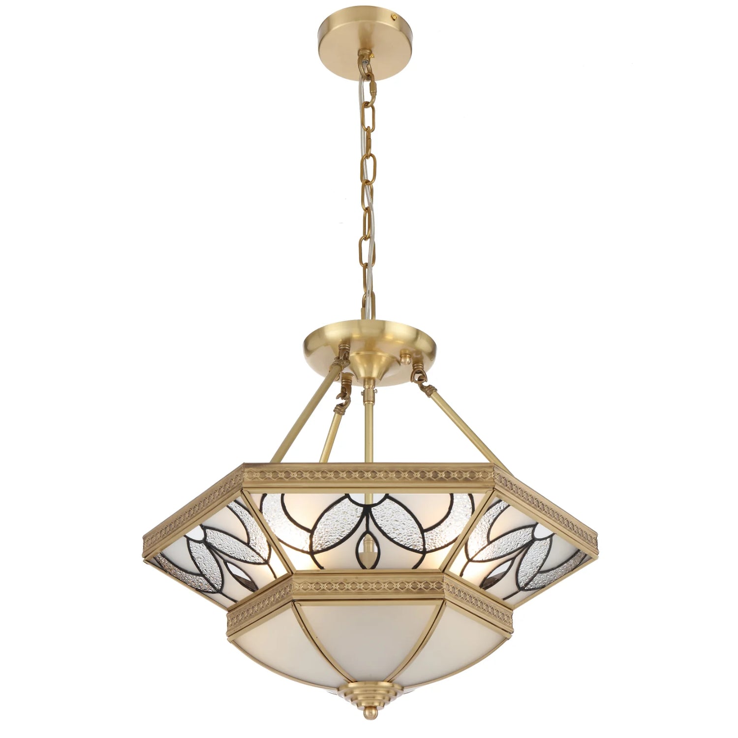 Featuring a dual-tiered design, the Orista Artisan Brass Pendant Light combines the elegance of leaded glass in the upper tier with the subtle sophistication of acid-frost glass in the lower tier. Handcrafted with precision and encased in a solid brass frame, it harmoniously blends artistry with craftsmanship. This exquisite pendant is a true testament to the marriage of form and function, bringing both aesthetic appeal and ambient lighting to your living spaces. Can be mounted as close to ceiling.