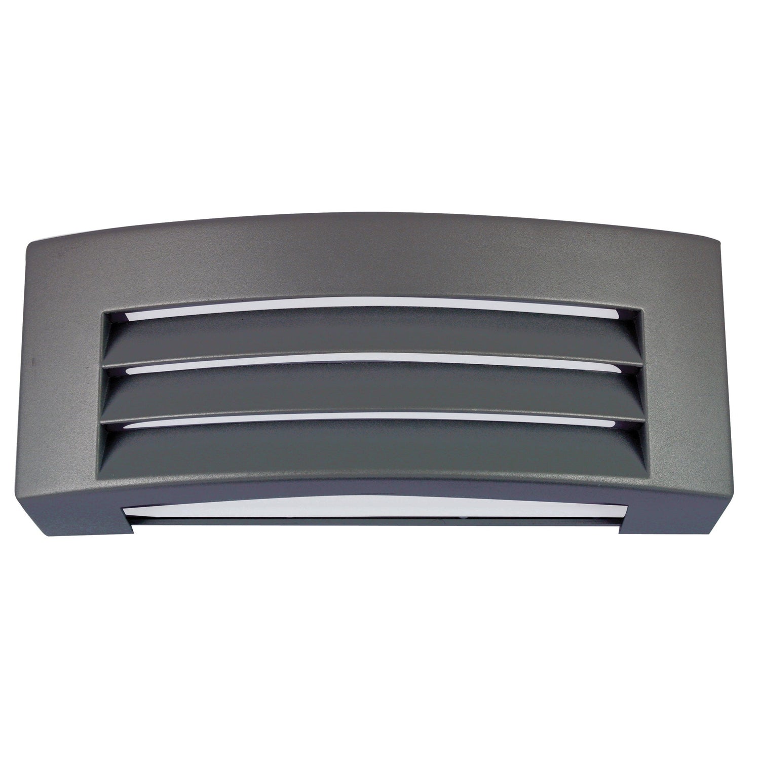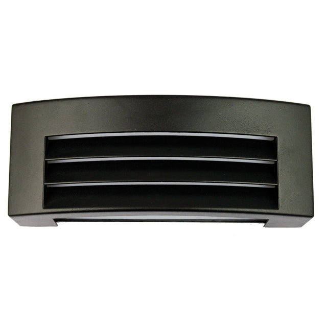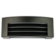 VISOR outdoor wall mounted bulkhead emits light from the top and bottom and through the lourved front. Visor is very smart looking, with the front having a gentle curve. Made from cast alloy and powdercoated in a textured finish, with an opal acrylic diffuser to reduce glare.