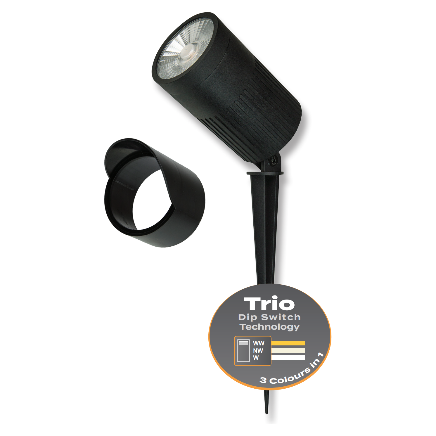 ZOOM-PRO 30W LED Garden Spike Light Series offers a range of different lighting effects in the one box. Simply push the button on the fitting to change colour temperatures. Or simply add the cover cap for low glare applications. Featuring a high output 30W LED chip, 40-degree beam angle, 150-degree tilt adjustable head and a black powder coated frame. Low voltage 12V/24V DC LED driver required. Complete with 3 metre round rubberised cable and water stopper for added protection from moisture entering the head unit. Backed by a 3 Year Replacement Warranty.