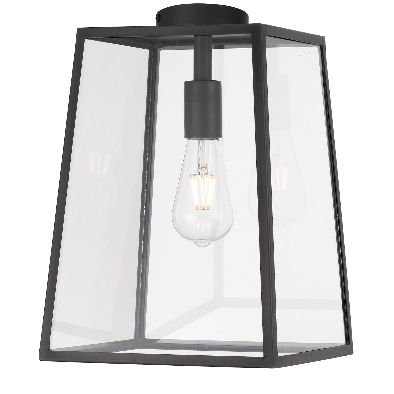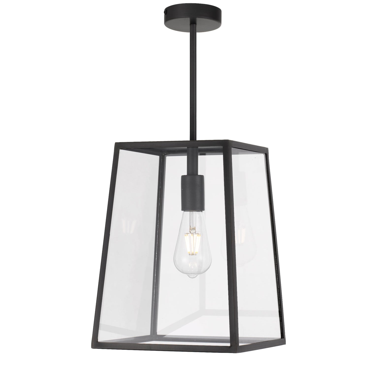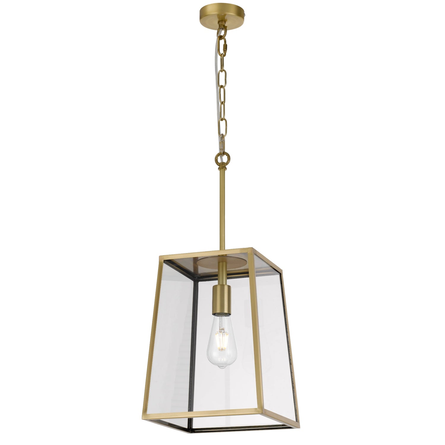 Cantena is a bold yet simple vintage outdoor pendant lamp. The tapered frame holds trapezoid clear glass and is suspended by a short rod with chain. The Cantena family is crafted in solid brass and finished in polished brass or brass painted in black. Available in 2 sizes, also as a wall lamp.