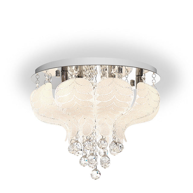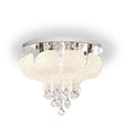 The Odessa is a classic, extravagant close to ceiling fixture. Embossed lass leaves are hand screen printed and draped with clear optic crystal shapes. The stainless steel ceiling plate reflects the light source to provide a spectacular lighting effect. Available in 2 sizes.