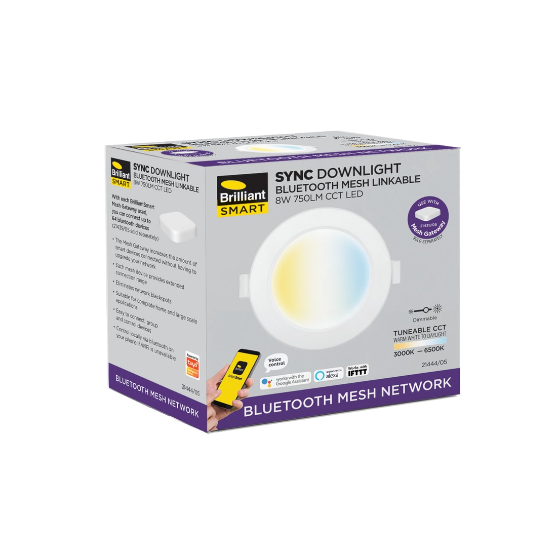 Bluetooth mesh is a many to many broadcast structure that allows you to connect devices using a Bluetooth network that can communicate with each other to form the mesh network. The Sync Mesh Downlight is a simple and flexible colour temperature tuneable light fitting. Low-maintenance solution for homes, offices, schools, retail and healthcare. Adjust the colour temperature and dim to suit. Change the colour temperature from a warm 3000K to a bright daylight 6500K. Provides a wide diffusion of clear, crisp light from an 8W LED light source. Fits in to standard 90mm cut-outs, perfect for new or retro-fit installations. External driver with flex & plug. (Total length 1.0 metre). Each mesh device provides extended connection range. Eliminates network blackspots. Suitable for complete home and large scale applications. Easy to connect, group and control panel lights. Control locally via Bluetooth on your phone or tablet or add a Mesh Gateway for greater functionality and automation.