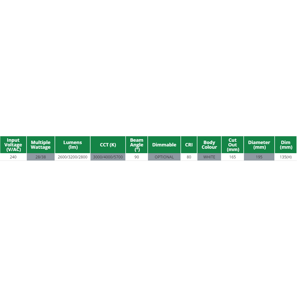 Dual power selection 28W/38W and selectable colour temperature via an integral DIP switch