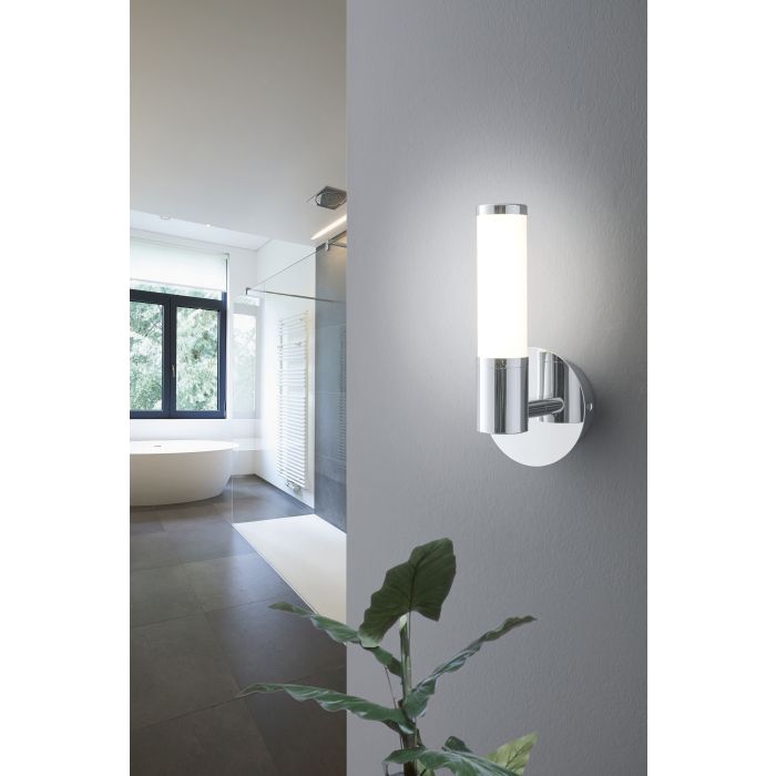 This bathroom wall luminaire from the series PALMERA 1 is made of chrome-plated steel and white, opal-matte glass. It has a rating of IP44 making it ideal for use around the bathroom vanity.