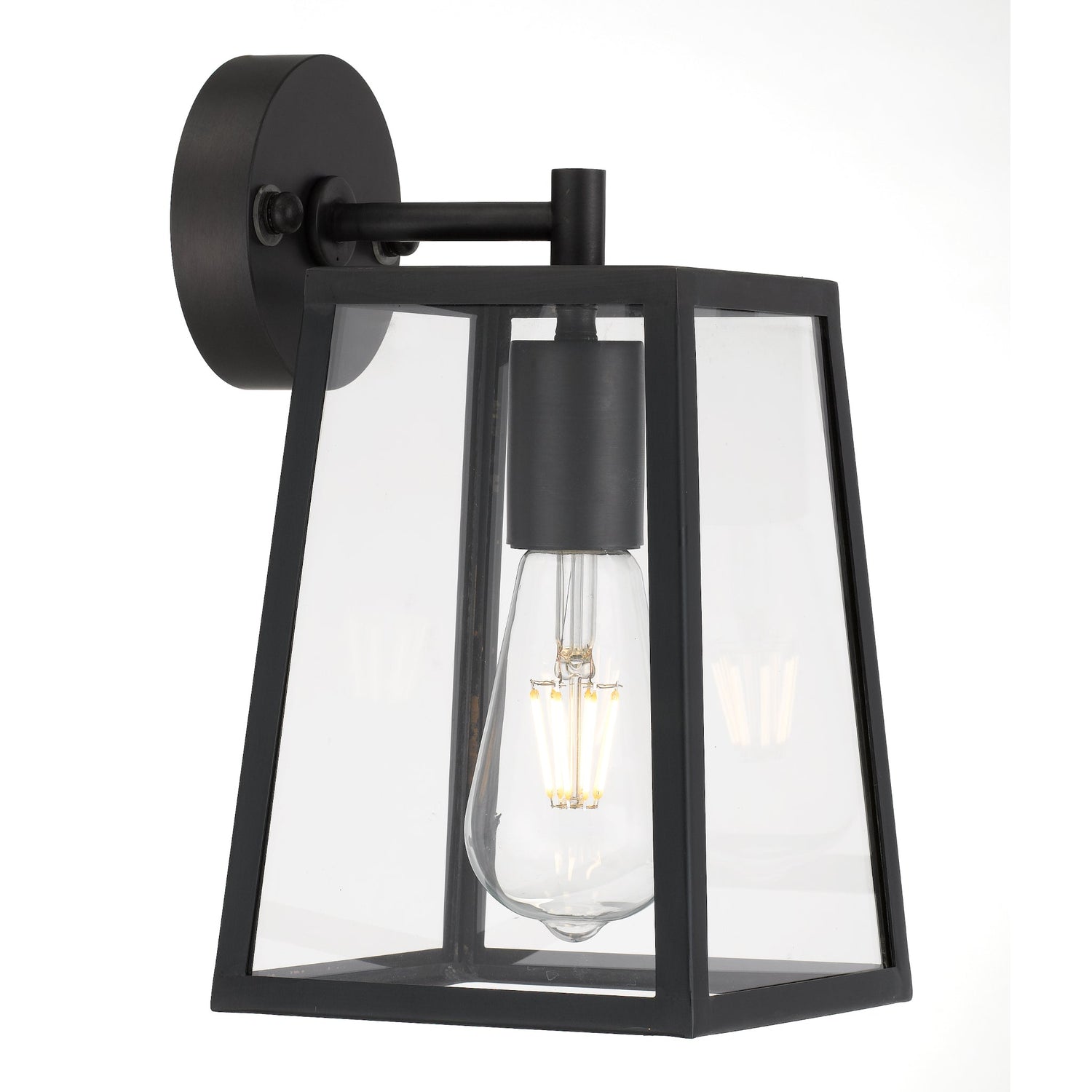 Cantena is a bold yet simple vintage outdoor wall lamp. The tapered frame holds trapezoid clear glass and is suspended by a simple arm. The Cantena family is crafted in solid brass and finished in polished brass or brass painted in black. Available in 2 sizes, also as pendant.