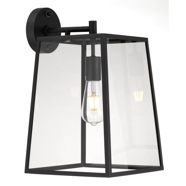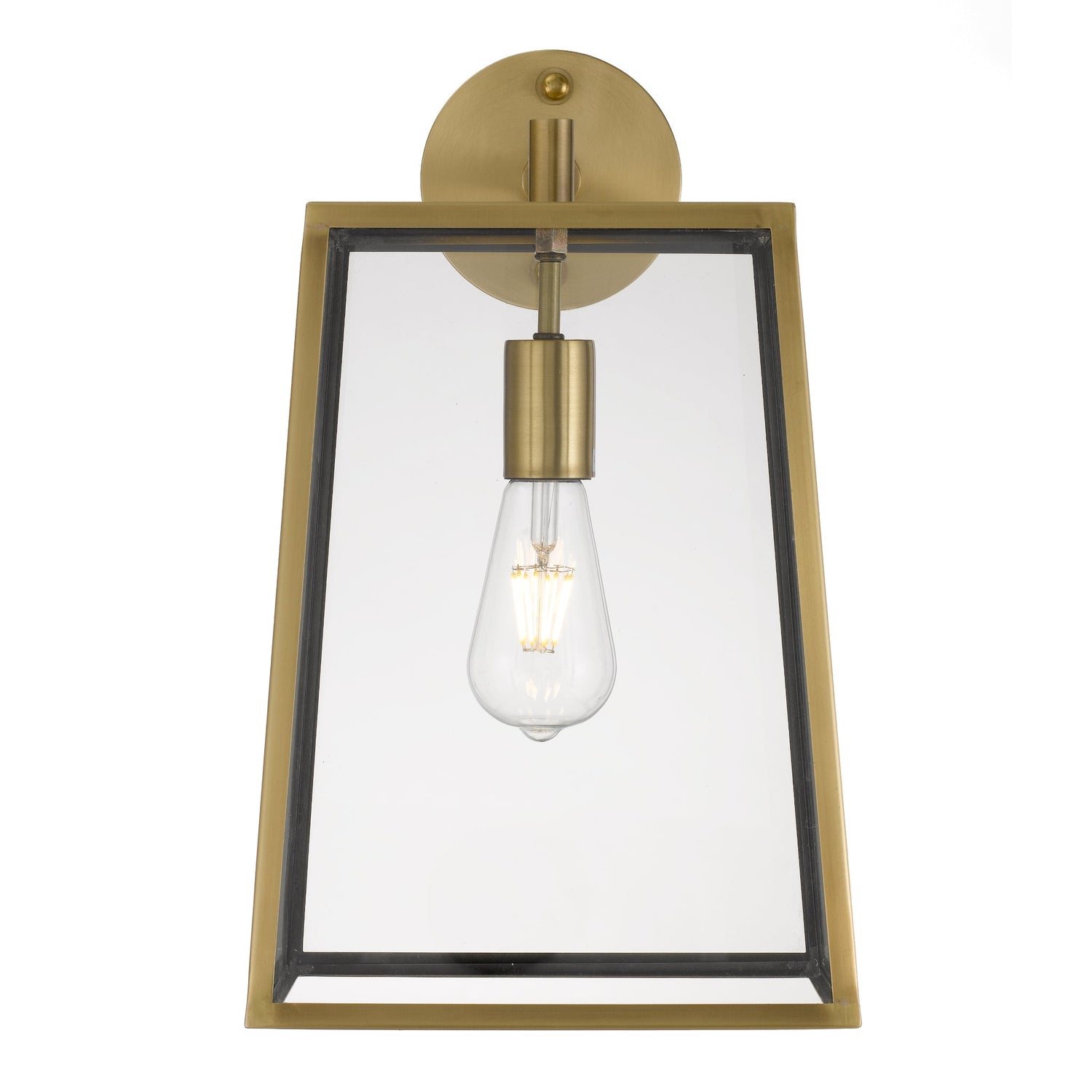 Cantena is a bold yet simple vintage outdoor wall lamp. The tapered frame holds trapezoid clear glass and is suspended by a simple arm. The Cantena family is crafted in solid brass and finished in polished brass or brass painted in black. Available in 2 sizes, also as pendant.