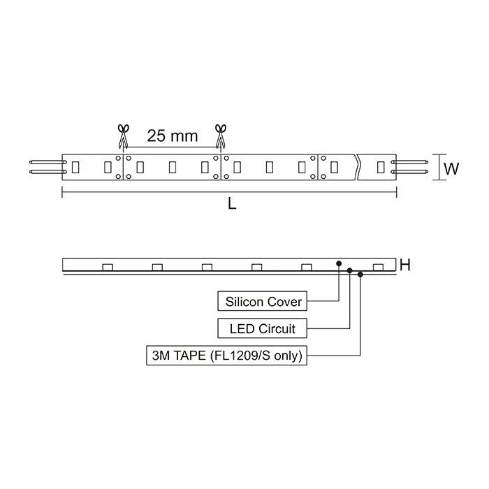 • Max run per driver 5m, cuttable every 25mm, dimmable with compatible drivers.