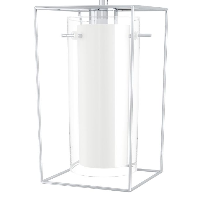 This pendant luminaire from the series LONCINO 1 is made of chrome-plated steel and clear and white satinised glass.