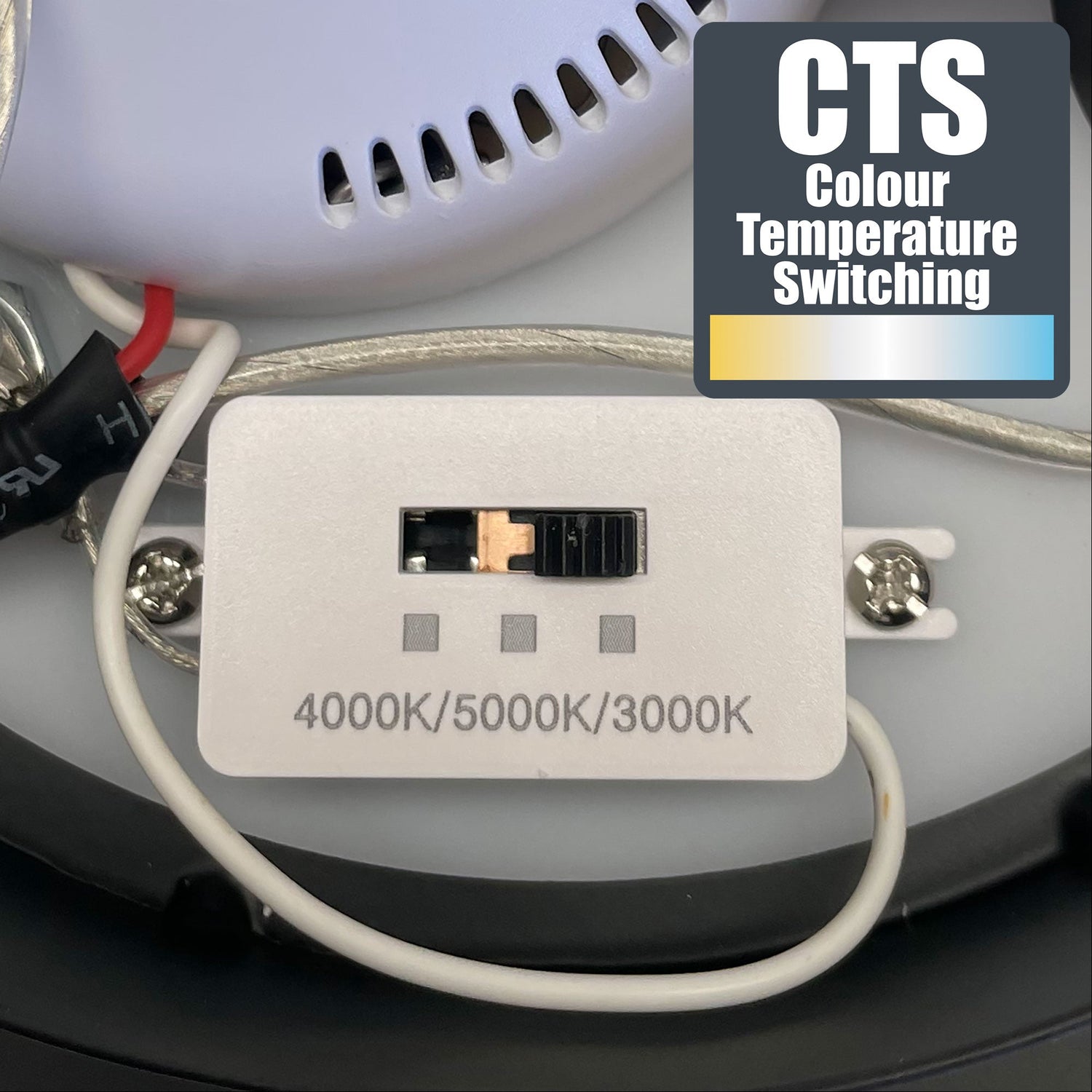 The CRONUS.60 CTS LED ring pendant with frosted edge. CTS (Colour Temperature Switching) allows the installing electrician to select the preferred colour temperature.