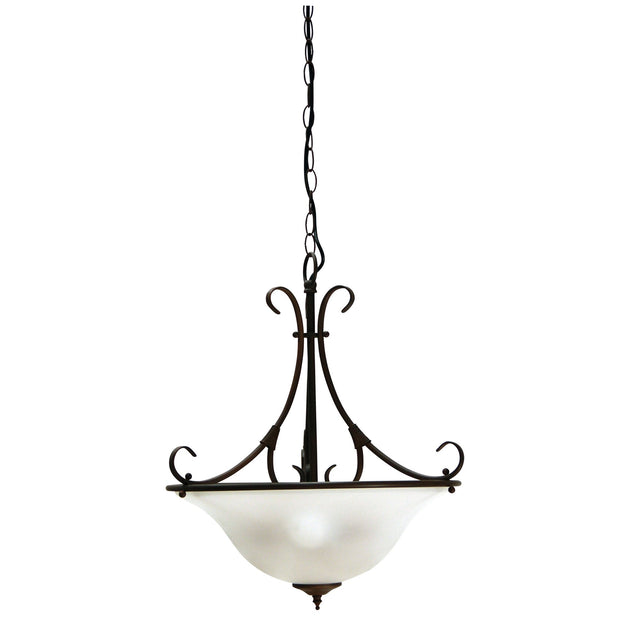 Traditional bronze coloured 3 light pendant with an upward facing frosted glass. Part of the Gaston light suite. Also available in a wall light, 3 light semi-flush, 5 light and a 9 light pendant.