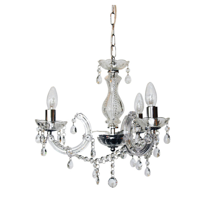 Classic candleabra style 3-light chandelier pendant in clear glass and chrome. Also available in a wall light and 5 or 8-light pendant. Clear candle shaped LED globes are recommended. Marie Therese suite is an ideal choice for Hamptons or traditional style homes