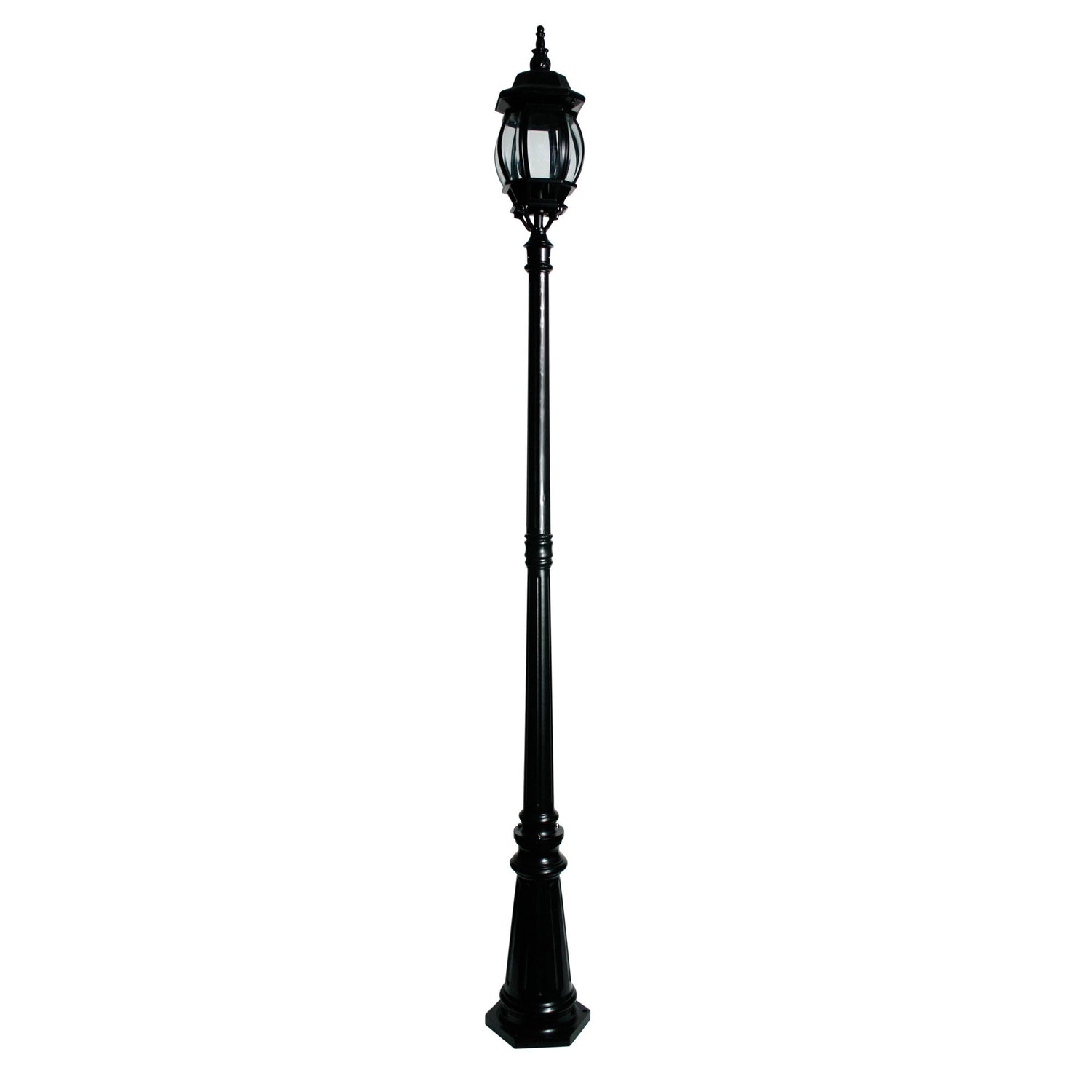 Traditional outdoor (IP44) post light, complete with a flanged base. Powder coated aluminium, in a matt black finish, with clear, bevelled glass panels. Matching wall lights are also available.
