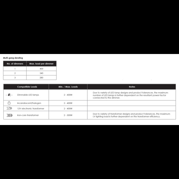 240V, maximum load up to 400W LED, minimum 2W, no neutral required, supplementary ON/OFF switch control required.