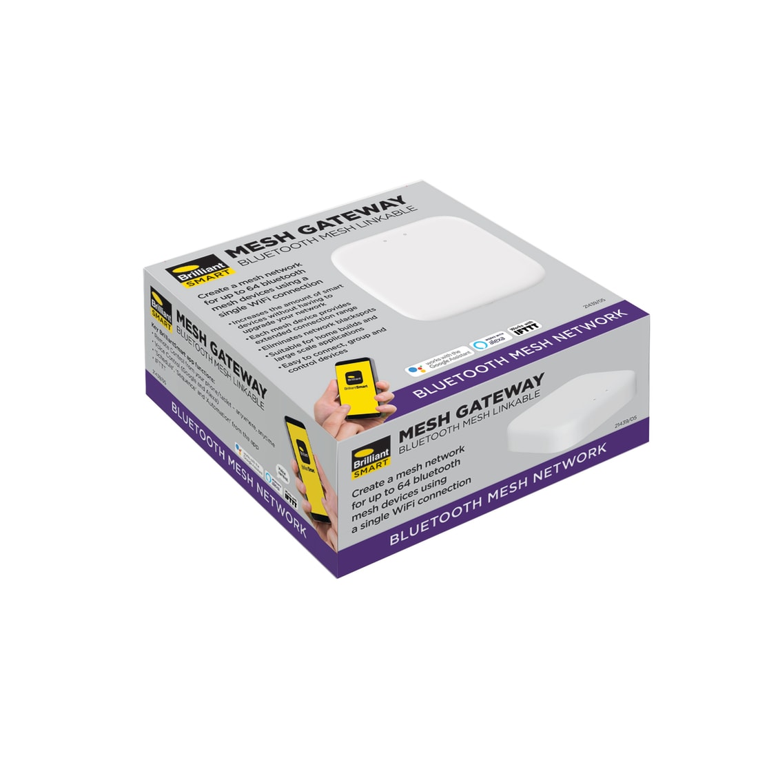 Bluetooth mesh is a many to many broadcast structure that allows you to connect devices using a Bluetooth network that can communicate with each other to form the mesh network. The Smart Mesh Gateway acts as the heart of the system, connecting all of your BrilliantSmart Mesh items to your network using one WiFi point allowing you to control them individually or in groups using the BrilliantSmart app. Create a mesh network for up to 64 Bluetooth mesh devices using a single WiFi connection. Increases the amount of smart devices without having to upgrade your network. Each mesh device provides extended connection range. Eliminates network blackspots. Suitable for home builds and large scale applications. Easy to connect, group and control devices. Combine additional gateways, each gateway connects up to 64 Bluetooth Mesh devices.