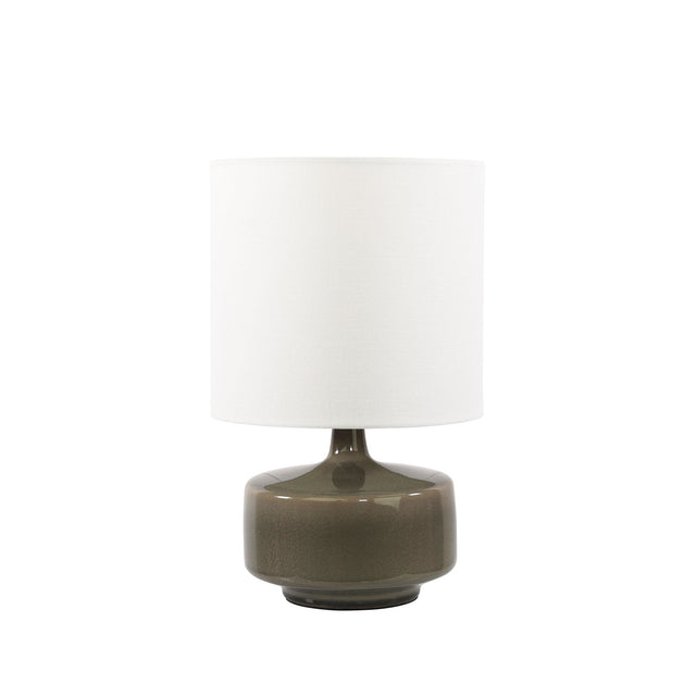 The FAWN ceramic table lamp comes complete with a fabric drum shade. This designer lamp is perfect for a living room or hallway table in a mid-century styled home. The on/off switch is located on the cord.