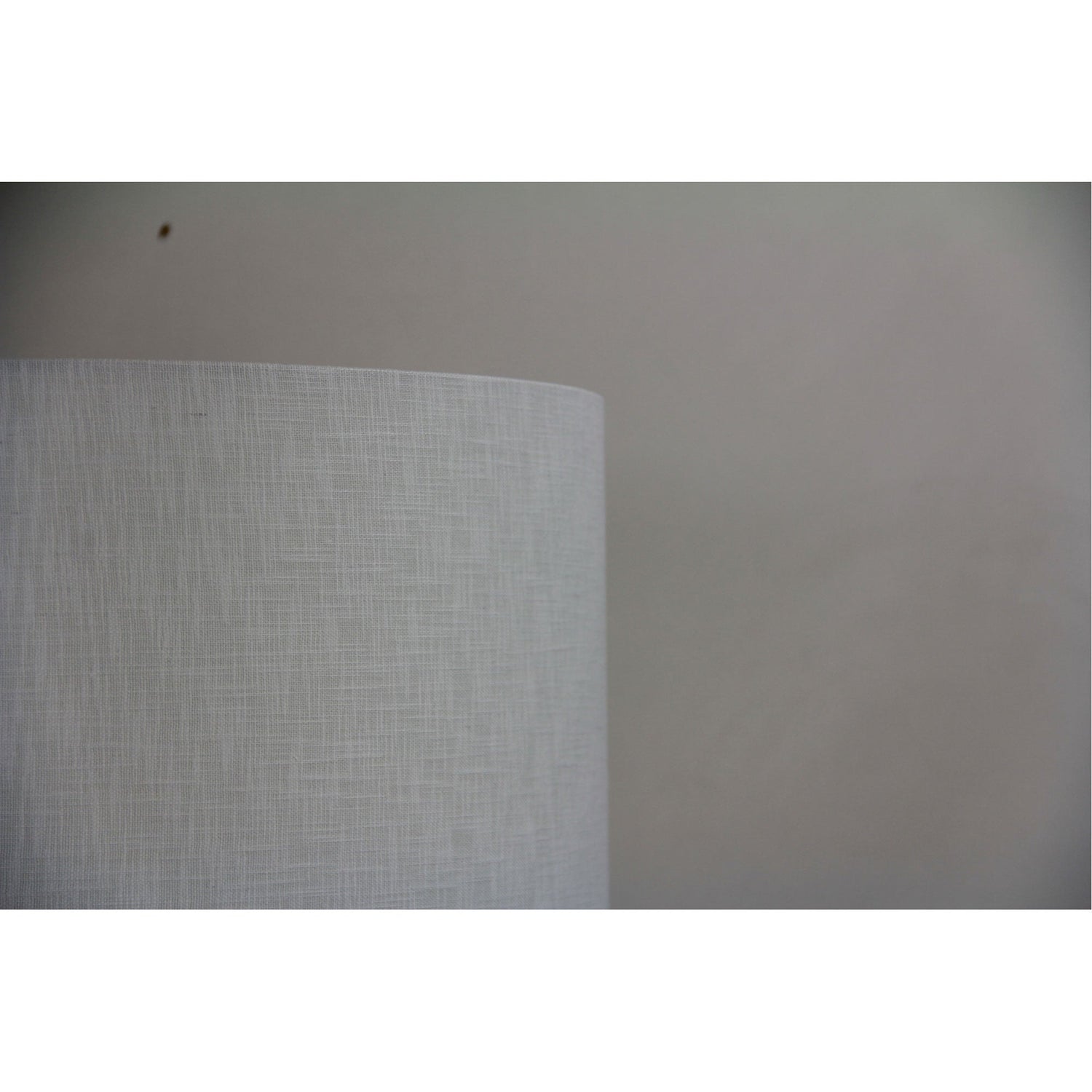 Medium-large (40cm diameter) hardbacked drum shade, finished with a rolled edge, in an off-white faux linen. The 16″ drum is suitable for use on either a large table lamp base (about 40cm high), slim floor lamp or a hanging suspension.