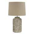 Andorra white washed, faux-timber table lamp base features a lovely floral relief pattern. Supplied complete with a flax linen hardback lampshade. Beautiful addition to a contemporary or traditional home. Switch is conveniently located on the cord.