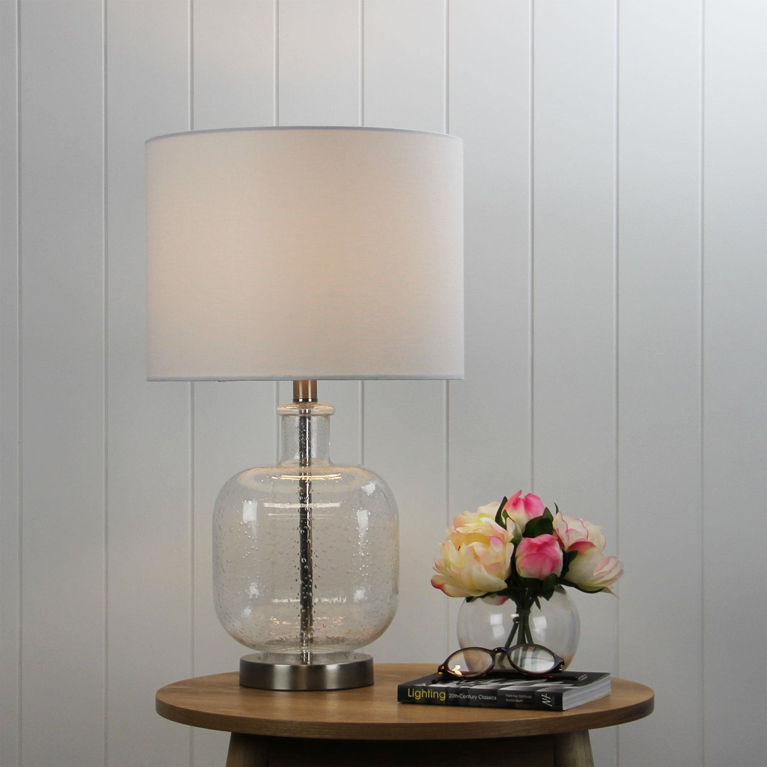ELISE is characterised by delicate bubbles within the clear, handblown glass, sitting upon a brushed chrome pedestal. Coupled with an ivory linen drum shade. A lovely contemporary lamp ideal for bedsides.