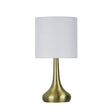 Compact LOLA in antique brass with white poly cotton drum shade. On/Off touch switch makes this a great bedside lamp. Uses a 42w small Edison screw globe. Suitable for LED energy saving globes.