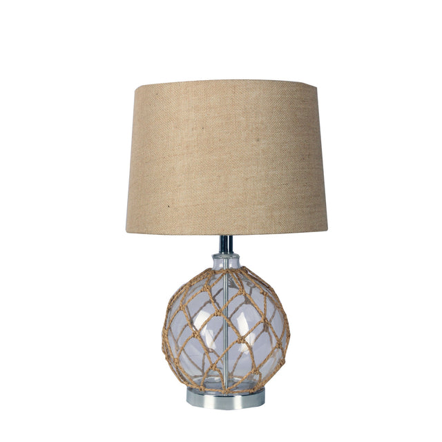 Full of character, the YAMBA is the perfect statement piece for any coastal or Hamptons inspired home. The chrome pedestal is adorned with a round glass base, covered in a fishing styled, natural fibre netting and completed with a large hessian, tapered shade.