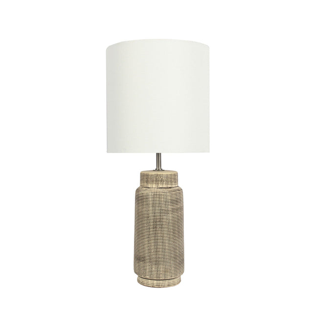 A tall, beige, base with inscribed, brown-black cross-hatching, a long brushed-chrome neck and an ivory linen drum shade make up the ZAMORA ceramic table lamp. Very retro.