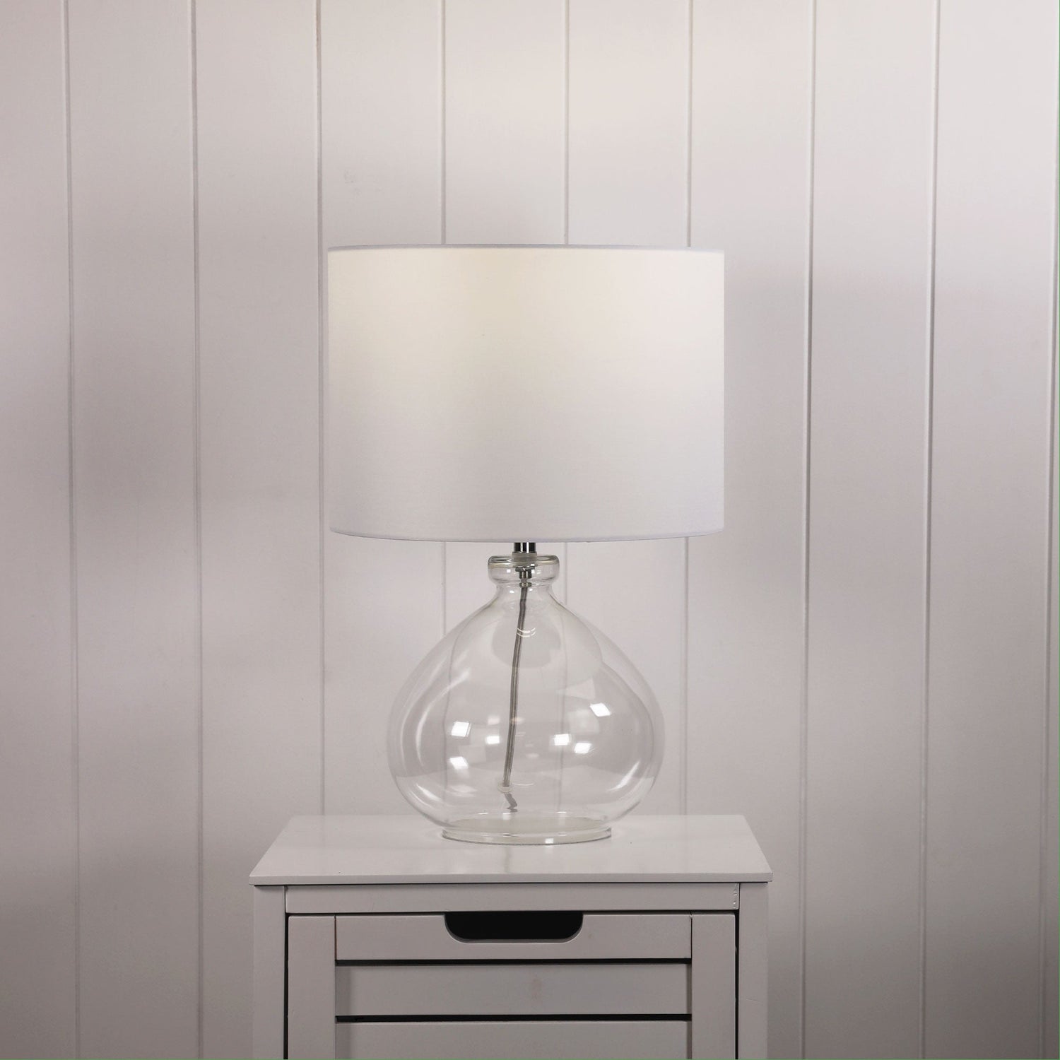 The MELFI table lamp is a subtle accent piece for any hallway or side table. The white cotton shade complements the rounded transparent glass base to create a relaxed coastal feel. The switch is conveniently located on the cord.
