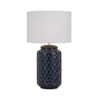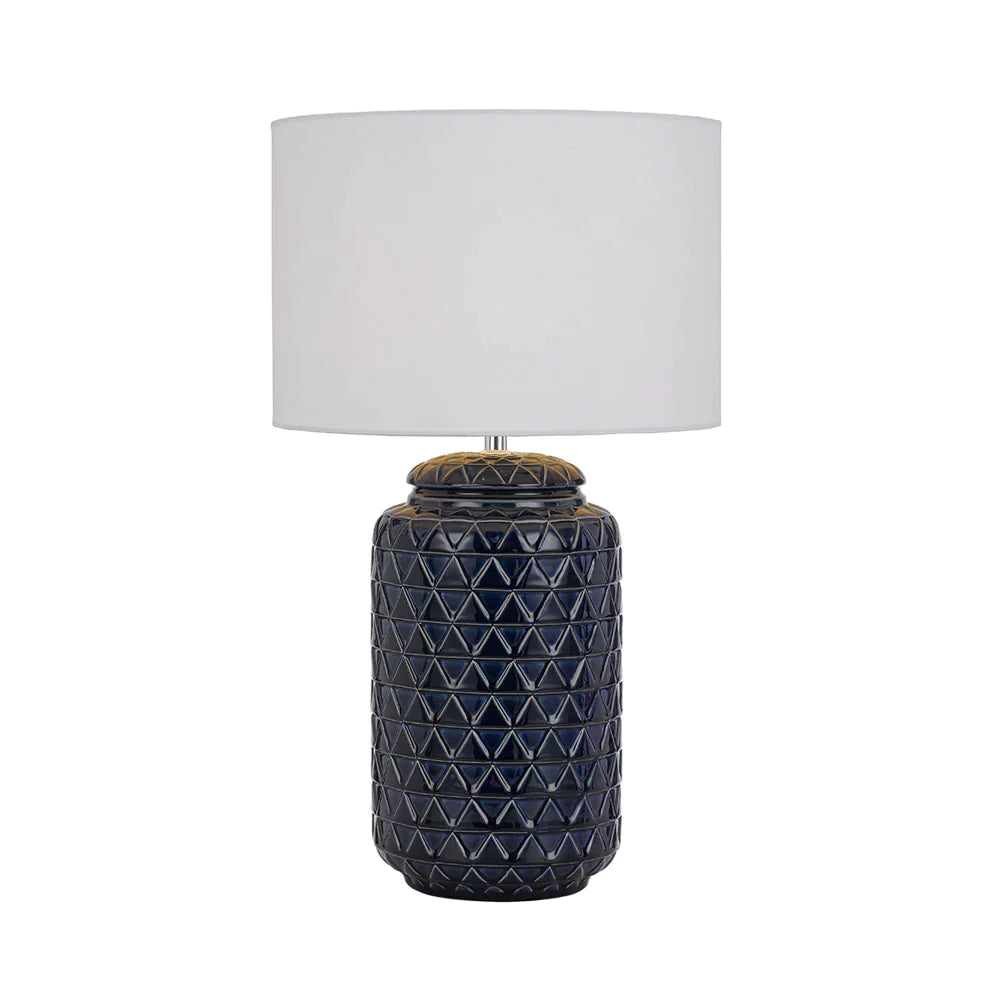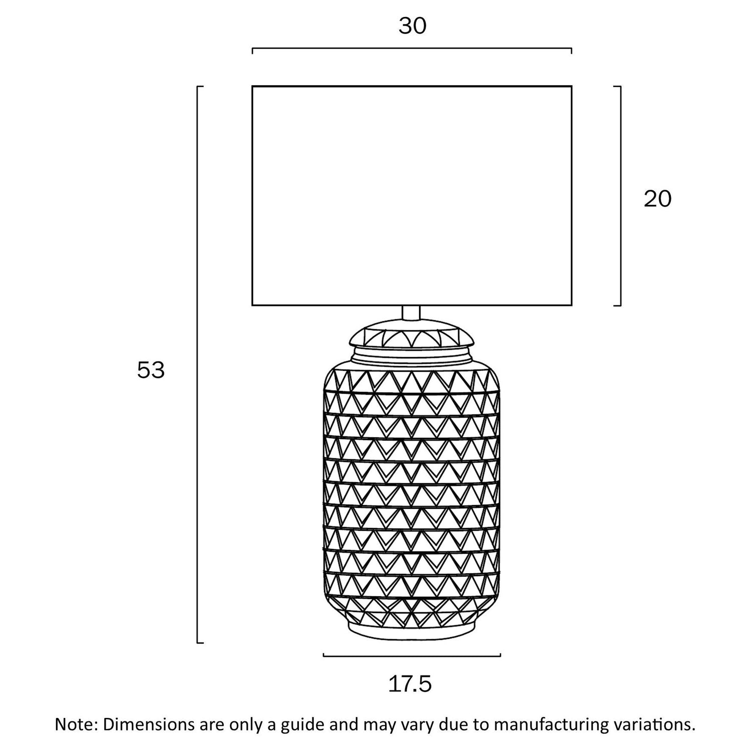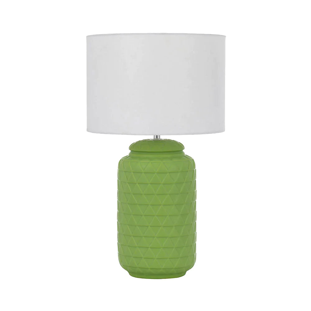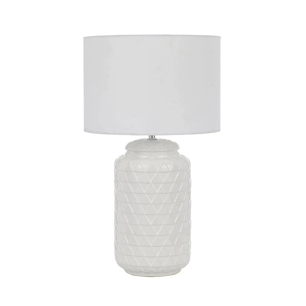 The perfect table lamp for accenting bedrooms, living areas, and entryways. The modern angular symmetrical pattern in the latest designer colors. Topped in a classic, white poly-cotton drum shade.