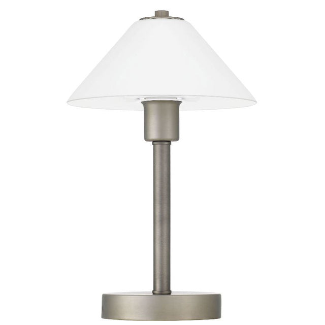 The Ohio contemporary design table lamp features a coolie shaped white glass shade, fixed to a slender brushed metal base. Touch anywhere on the metal base to turn on or off. Available in either antique brass, black or nickel base.