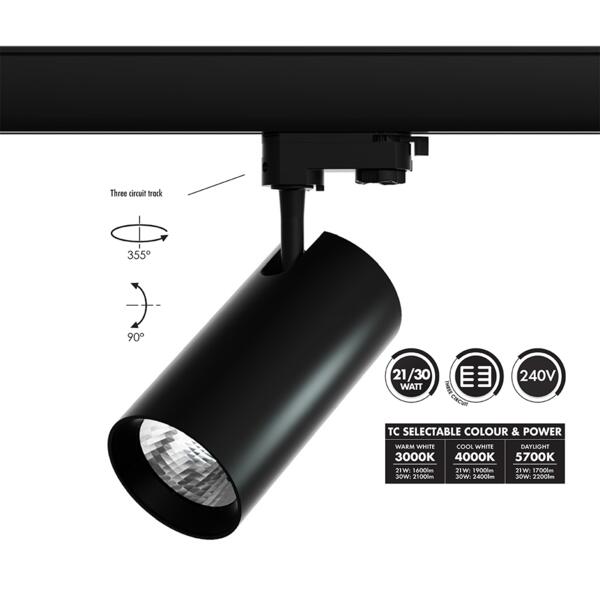 Unitrek three circuit, 21/30 watt architectural track spot, with integral dual power driver and selectable colour temperature