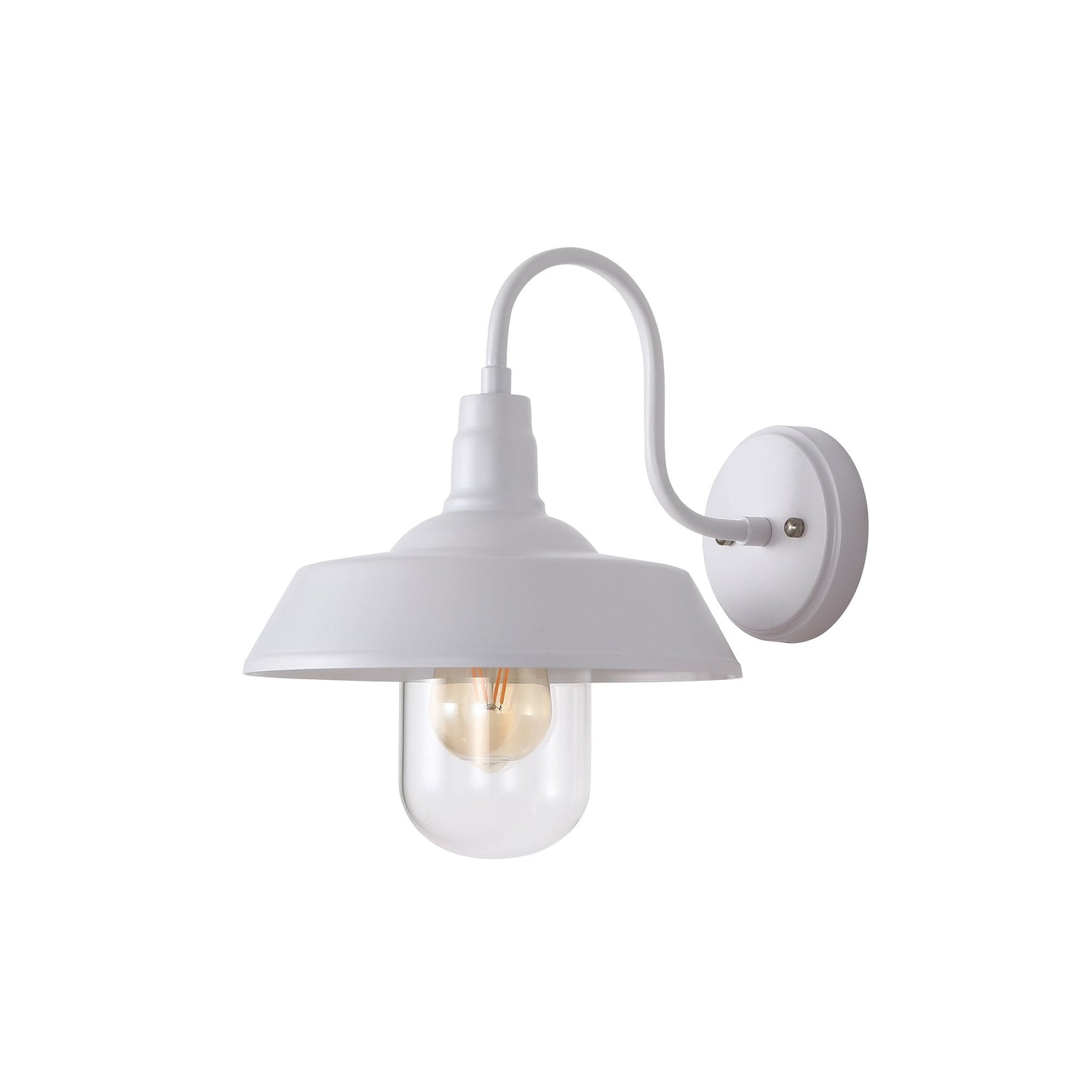 Hudson barn style wall light. Lovely matt finish with a clear glass. Suits Hamptons, traditional, mid-century or contemporary homes. Ideal for outdoor, protected areas. White inner shade provides good light reflection.