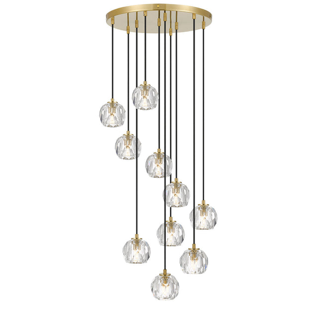 Spheres of prismatic cut crystal bring contemporary glamour to the Zaha collection. Each sphere is illuminated with a LED twinkle globe accentuating the cut surface. The family includes a 1 light pendant, 1 light wall lamp, 2 light table lamp, 4 light bar pendant, 5 light round pendant and 10 light round pendant. Available in Antique gold or chrome.